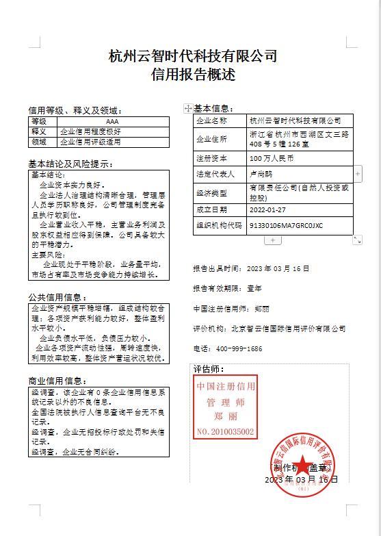 信用認(rèn)證機(jī)構(gòu):北京智云信國際信用評(píng)價(jià)有限公司