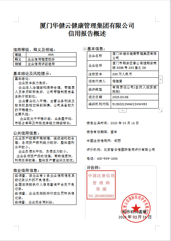 二、本信用證書和信用檔案是中立和中性的,它證明該單位已納入社會(huì)信用體系的監(jiān)督之中,任何組織和個(gè)人可以遵循誠信原則方便地對(duì)該單位進(jìn)行評(píng)價(jià)(表?xiàng)?、批評(píng)、建議);任何組織和個(gè)人可以方便地查詢?cè)搯挝涣己眯畔ⅰ⒉涣夹畔⒑驼男畔ⅰT搯挝灰部梢酝ㄟ^誠信經(jīng)營不斷增加信用分值和增加良好信用信息記錄,積累信用無形資產(chǎn)。三、根據(jù)該單位提供的相關(guān)資料,依據(jù)中華人民共和國信用行業(yè)標(biāo)準(zhǔn)Q/ZYX 002-2019《企業(yè)信用評(píng)價(jià)體系標(biāo)準(zhǔn)》,專業(yè)第三方信用評(píng)價(jià)機(jī)構(gòu)或信用認(rèn)證機(jī)構(gòu)對(duì)其信用等級(jí)評(píng)定為:AAA 級(jí)。四、提醒該信用檔案、信用證書及信用銘牌的使用者:請(qǐng)密切關(guān)注合作和交易對(duì)方的各項(xiàng)信用指標(biāo)或最新信用報(bào)告或年檢記錄信息,整體把握信用風(fēng)險(xiǎn),以保障合作和交易安全;請(qǐng)隨時(shí)關(guān)注合作和交易對(duì)方的信用動(dòng)態(tài)變化或跟蹤評(píng)價(jià)報(bào)告,及時(shí)把握信用趨勢(shì),以掌控商業(yè)風(fēng)險(xiǎn)。信用是企業(yè)的生命線;信用檔案是企業(yè)信用評(píng)價(jià)結(jié)果的動(dòng)態(tài)記錄,具有法律效力的信用證書是企業(yè)、商家及網(wǎng)站的第二“信用身份證”,信用檔案和信用證書是企業(yè)、商家及網(wǎng)站獲得客戶信任、促成合作和交易的基礎(chǔ),是大眾消費(fèi)、合作和交易決策的重要依據(jù),是我國社會(huì)信用體系建設(shè)的公平保障體系。