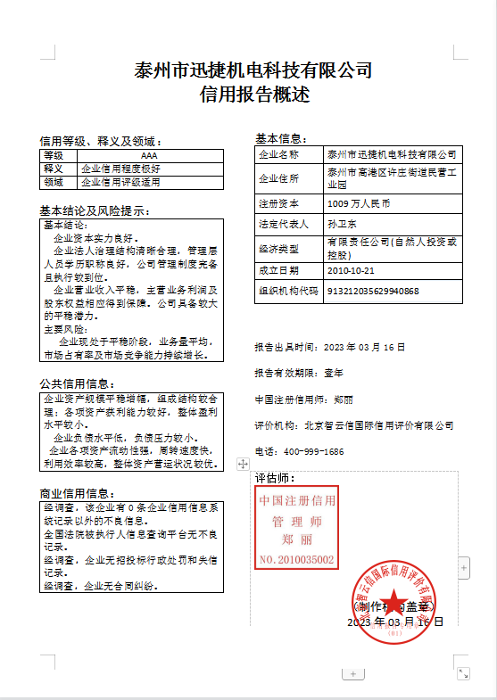 二、本信用證書和信用檔案是中立和中性的,它證明該單位已納入社會(huì)信用體系的監(jiān)督之中,任何組織和個(gè)人可以遵循誠信原則方便地對(duì)該單位進(jìn)行評(píng)價(jià)(表?xiàng)睢⑴u(píng)、建議);任何組織和個(gè)人可以方便地查詢?cè)搯挝涣己眯畔?、不良信息和整改信息。該單位也可以通過誠信經(jīng)營不斷增加信用分值和增加良好信用信息記錄,積累信用無形資產(chǎn)。三、根據(jù)該單位提供的相關(guān)資料,依據(jù)中華人民共和國信用行業(yè)標(biāo)準(zhǔn)Q/ZYX 002-2019《企業(yè)信用評(píng)價(jià)體系標(biāo)準(zhǔn)》,專業(yè)第三方信用評(píng)價(jià)機(jī)構(gòu)或信用認(rèn)證機(jī)構(gòu)對(duì)其信用等級(jí)評(píng)定為:AAA 級(jí)。四、提醒該信用檔案、信用證書及信用銘牌的使用者:請(qǐng)密切關(guān)注合作和交易對(duì)方的各項(xiàng)信用指標(biāo)或最新信用報(bào)告或年檢記錄信息,整體把握信用風(fēng)險(xiǎn),以保障合作和交易安全;請(qǐng)隨時(shí)關(guān)注合作和交易對(duì)方的信用動(dòng)態(tài)變化或跟蹤評(píng)價(jià)報(bào)告,及時(shí)把握信用趨勢(shì),以掌控商業(yè)風(fēng)險(xiǎn)。信用是企業(yè)的生命線;信用檔案是企業(yè)信用評(píng)價(jià)結(jié)果的動(dòng)態(tài)記錄,具有法律效力的信用證書是企業(yè)、商家及網(wǎng)站的第二“信用身份證”,信用檔案和信用證書是企業(yè)、商家及網(wǎng)站獲得客戶信任、促成合作和交易的基礎(chǔ),是大眾消費(fèi)、合作和交易決策的重要依據(jù),是我國社會(huì)信用體系建設(shè)的公平保障體系。
